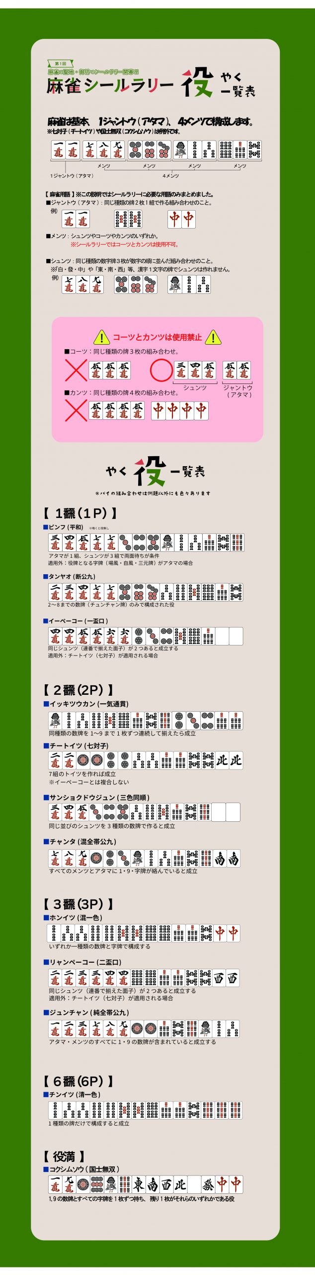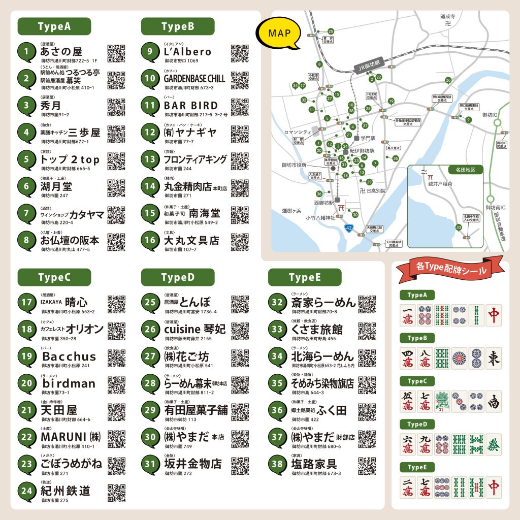 手持ち牌シールと参加店舗でもらえる牌シールを合わせて、役が完成すれば景品と交換できるという、ちょっとユニークでちょっとアツい御坊のまち巡りイベントです。→対象役についてはこちら