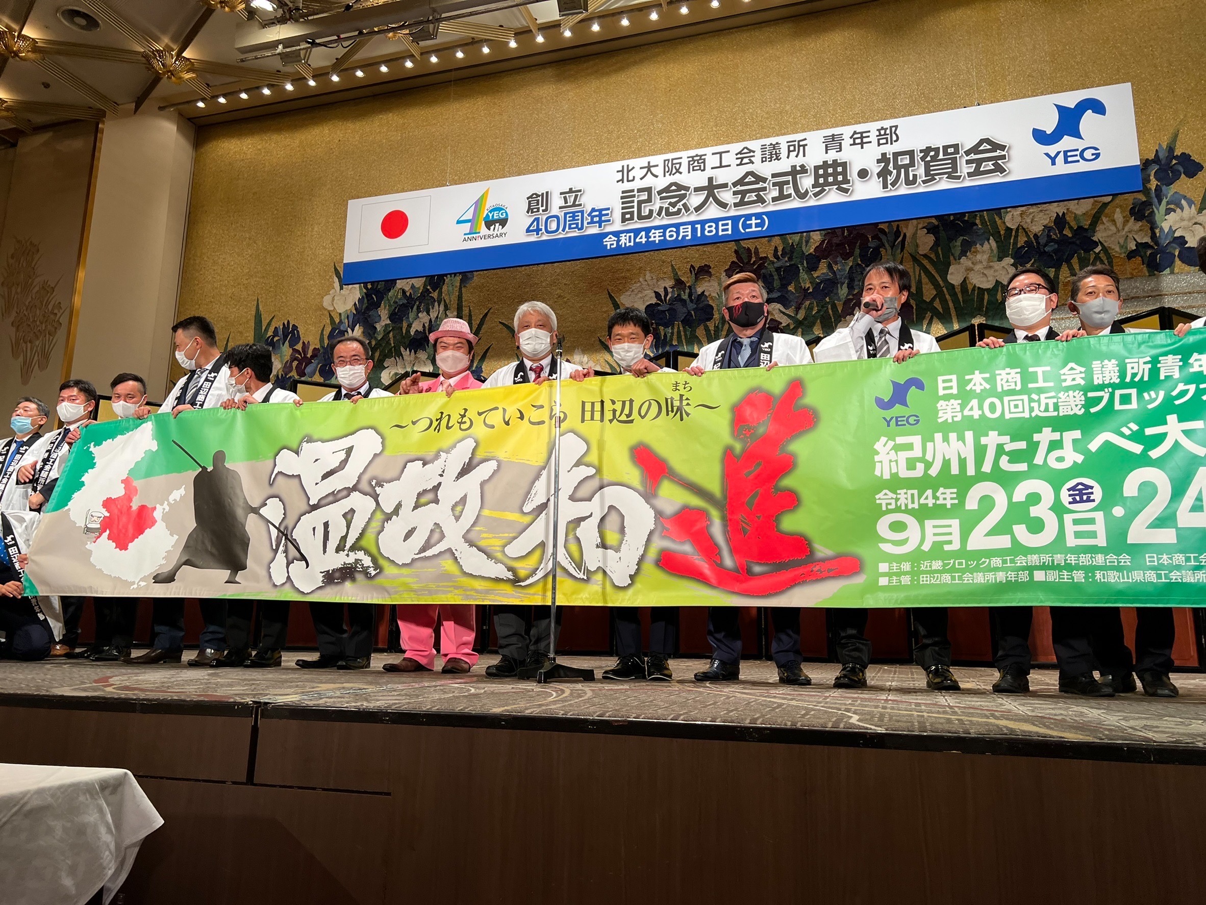 6月18日(土)リーガロイヤルホテル大阪において、北大阪商工会議所青年部「創立四十周年記念式典」が開催されました。御坊YEGからは2名が出席。記念式典と祝賀会が挙行され、北大阪YEGの記念すべき節目の年を祝いました。祝賀会では、今年の9月に開催される近畿ブロック大会「紀州たなべ大会」のPRを、田辺YEGの皆さんと一緒に行いました。