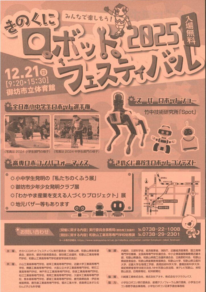 今年も「きのくにロボットフェスティバル」が御坊市立体育館での開催となります。今回で18回目を迎えるこの大会では、全国の予選を勝ち抜いた小中学生が熱い戦いを繰り広げます。皆様のご来場をお待ちしております。
