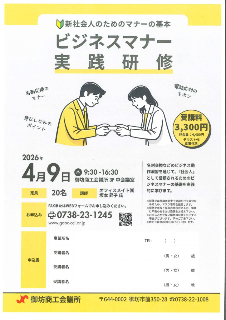 御坊商工会議所では「社会人」としてのビジネスマナーを醸成する研修を開催します。