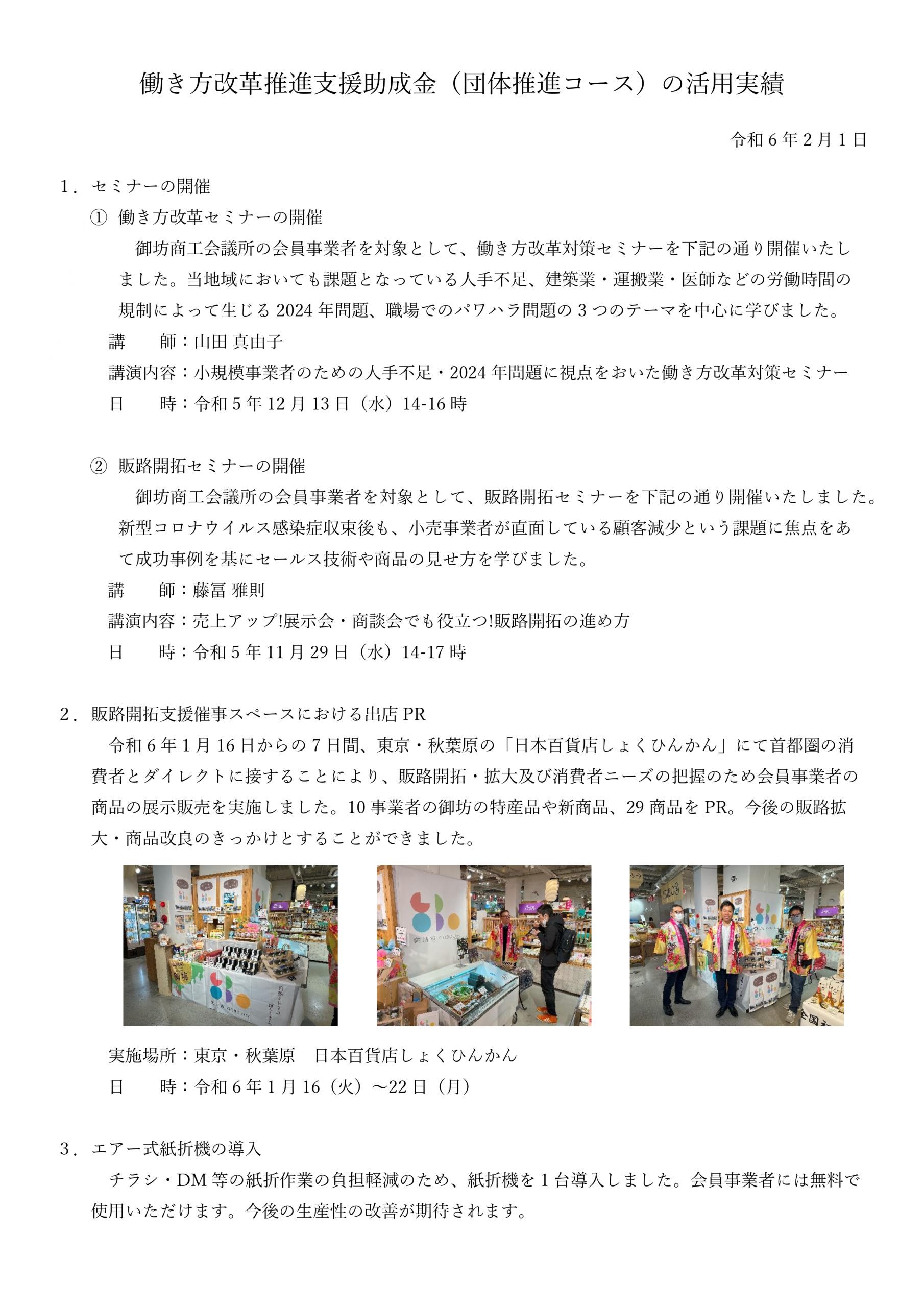御坊商工会議所では、働き方改革推進支援助成金(団体推進コース)を活用し、会員事業者を中心とした御坊地域における中小企業の働き方改革に関する啓発普及び販路開拓支援に取組みました。今後の更なる販路開拓、労働環境の改善が期待されます。引き続き各助成金を有効活用し、働き方改革をはじめ様々な問題解決に取り組んで参ります。お困りのことがございましたら、御坊商工会議所までご相談ください。