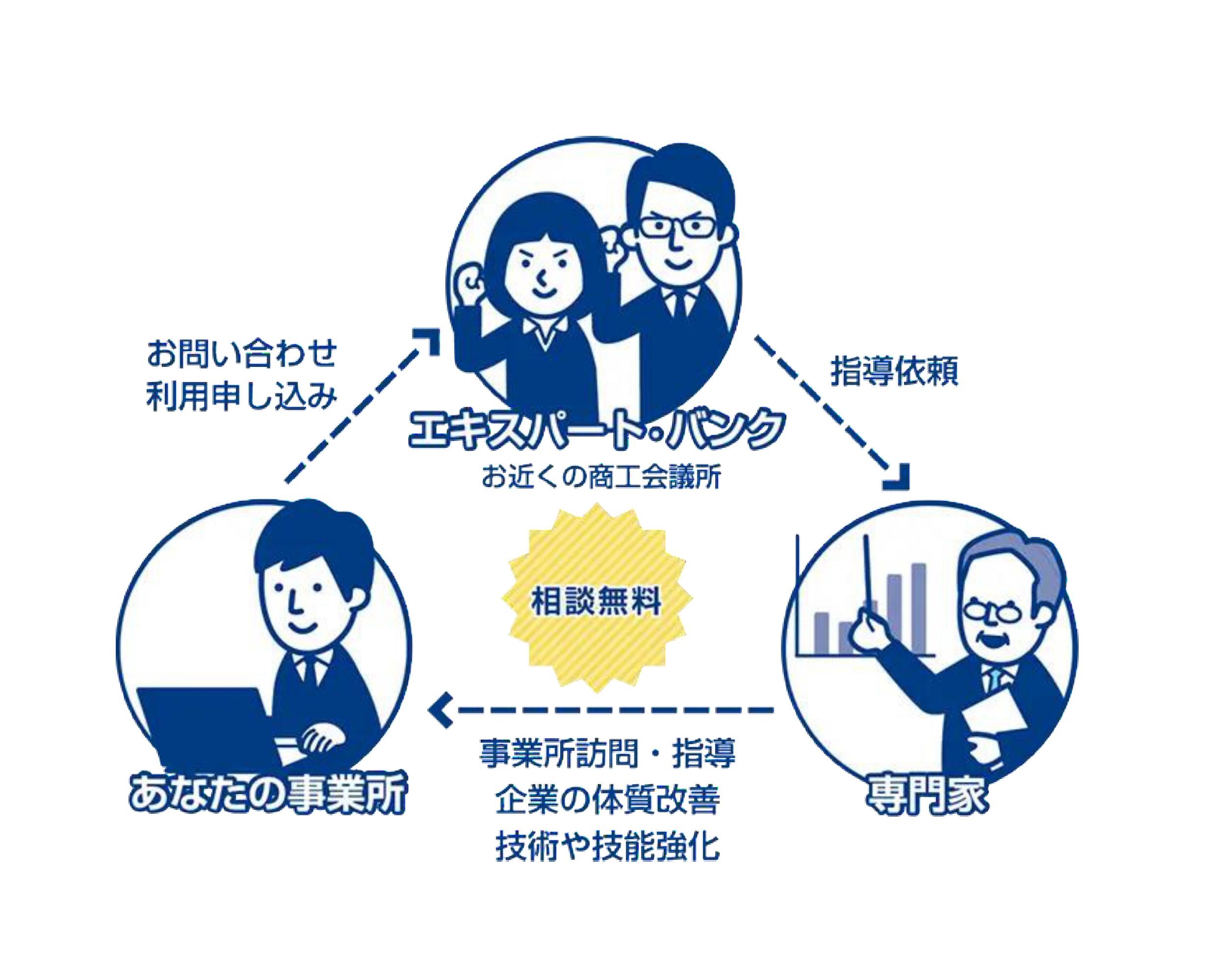 エキスパートバンク制度は、技術や技能をはじめ、企業の体質改善・強化を考えている小規模企業者の方々に、商工会議所に登録されたエキスパート(専門家)を直接派遣して、ハード・ソフト両面から具体的・実践的な助言を行うことにより問題解決を図る制度です。