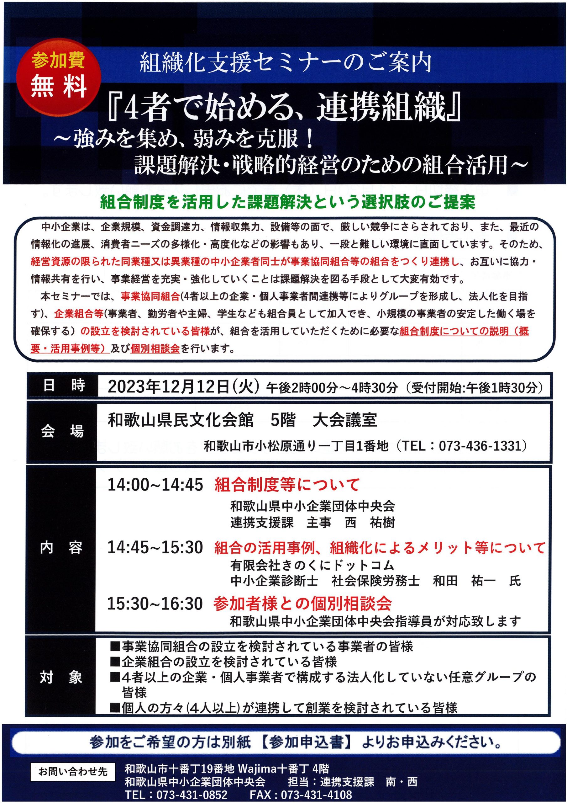 和歌山県中小企業団体中央会では、事業協同組合・企業組合等の設立を検討されている皆様が、組合を活用していただくためにひるような組合制度についての説明(概要・活用事例等)及び個別相談会を開催します。